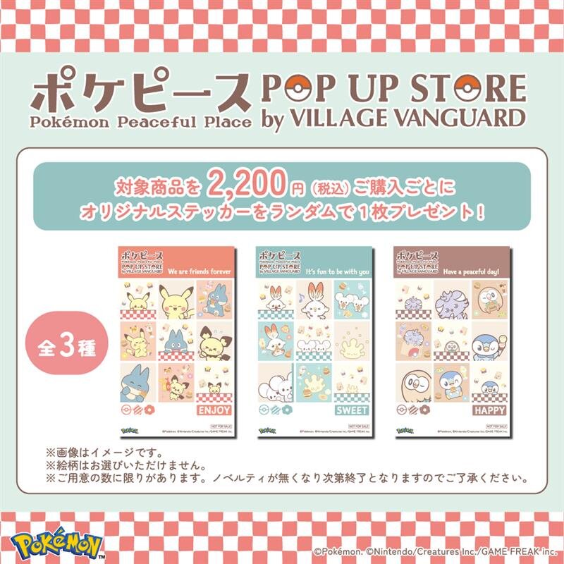 「ポケピース POP UP STORE by VILLAGE VANGUARD」では、期間中に「ポケピース」関連商品を税込2,200円ごとに購入すると、**オリジナルステッカー(全3種)**の中からランダムで1枚がプレゼントされます。