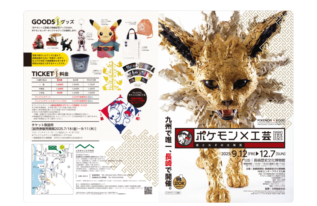 「ポケモン×工芸展―美とわざの大発見―」では、展覧会限定のグッズがたくさん登場していて、「工字繋ぎ」の着物を着たピカチュウのぬいぐるみや工芸作家デザインのピンズ、かわいいフリーカップや和テイストの巾着、アートプリントのキーホルダー、レース技法を活かしたピカチュウ作品など、どれもポケモンのかわいさと職人技がギュッと詰まったアイテムばかりで、手に取ってその質感やこだわりを感じられる体験も楽しめるうえ、長崎会場では作家が一点ずつ仕上げたオリジナル作品の抽選販売もあって、展覧会のワクワクを日常に持ち帰りながらお気に入りを見つけられるチャンスになっています。